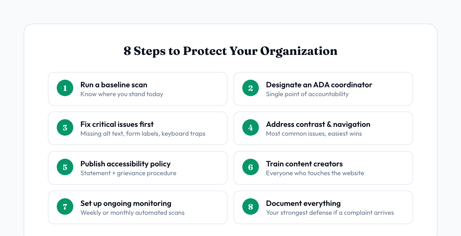 - 8. Document everything. If a complaint does arrive, the strongest defense is documented good faith effort — scan results showing improvement over time, a published accessibility statement, training records, and a remediation plan. The DOJ has consistently treated proactive organizations more favorably than those caught doing nothing.