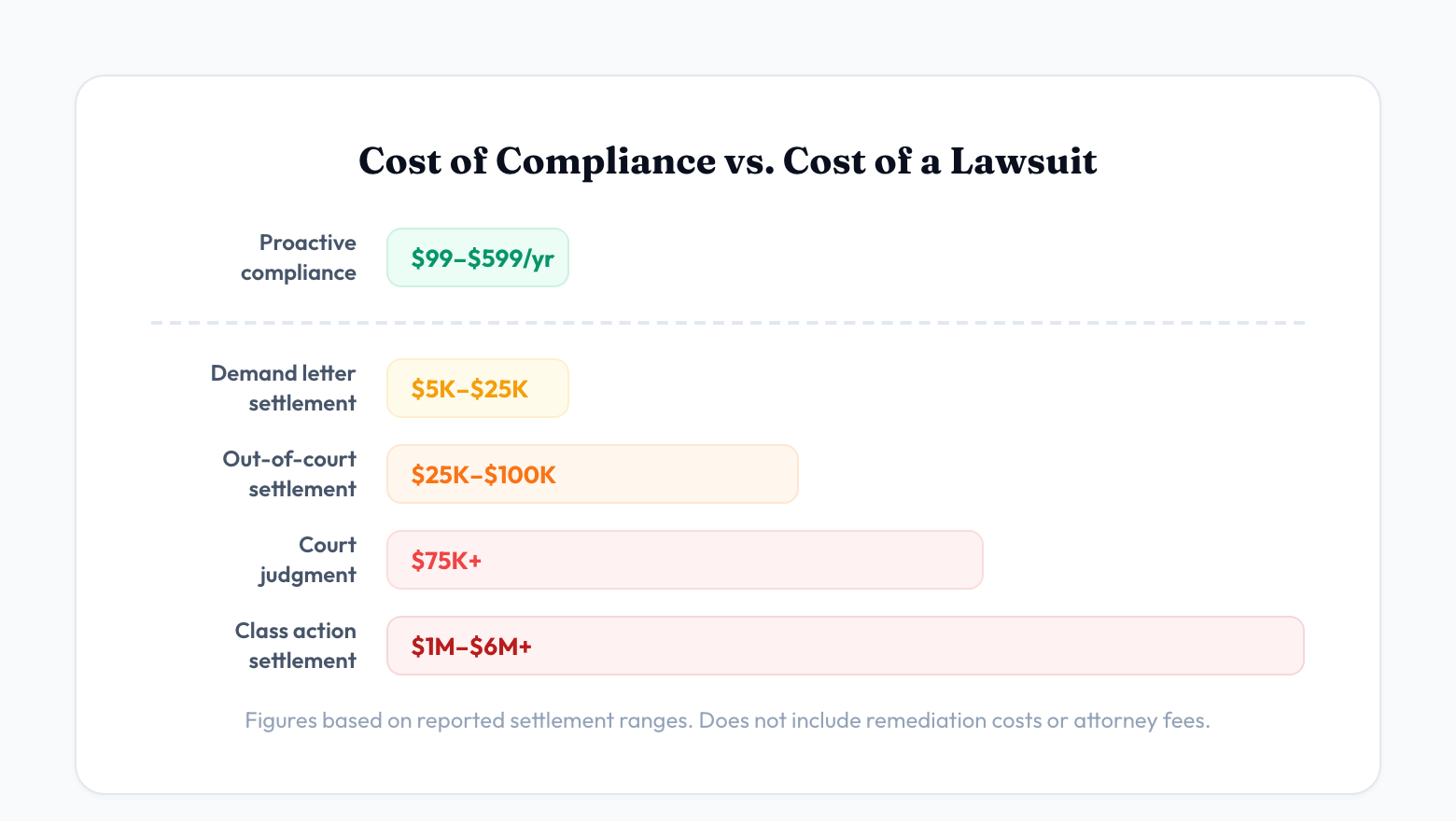 These figures do not include the cost of remediation itself, ongoing monitoring, attorney fees (yours and theirs), or the staff time consumed by an extended legal process. For a school district or small town, even a $25,000 demand letter settlement is a meaningful budget hit — especially when the cost of proactive compliance is a fraction of that.