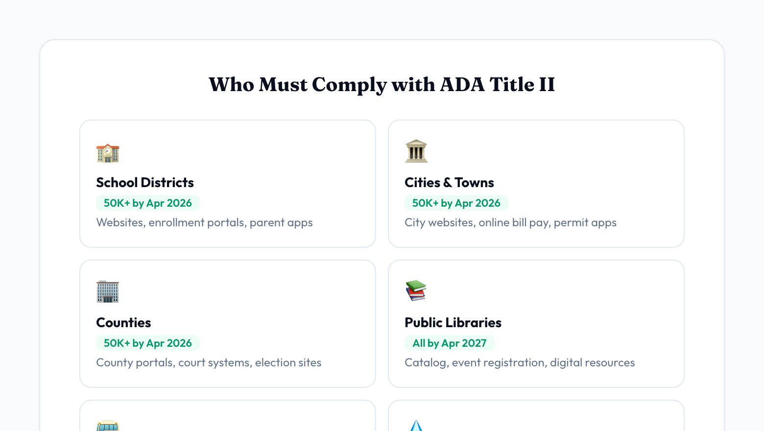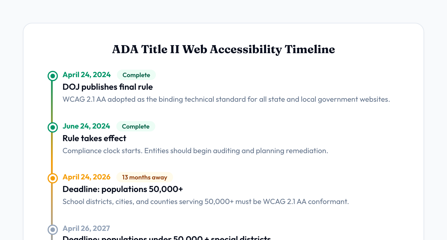 If your district or municipality falls in the first group, you have until April 2026. That is not a target date — it is a compliance deadline. After that date, a non-conforming website is a federal civil rights violation.