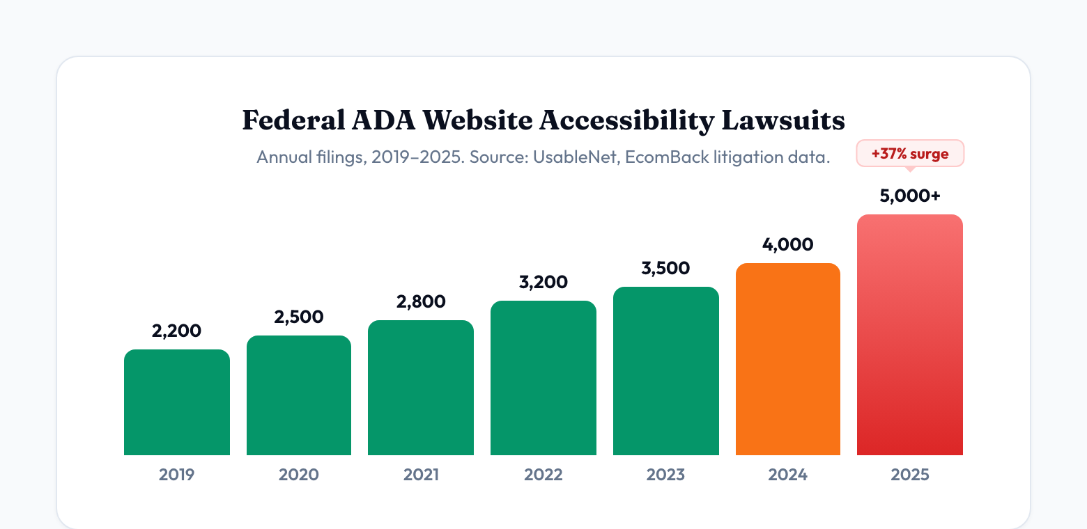 Private lawsuits. ADA website accessibility lawsuits surged 37% in the first half of 2025 alone, with over 5,000 federal cases filed that year. While most target private businesses under Title III, the new Title II rule gives plaintiffs' attorneys clear grounds to sue government entities after the compliance deadlines pass. There is no ambiguity left — the standard is defined, the deadline is published, and non-compliance is straightforward to prove with automated scanning tools.